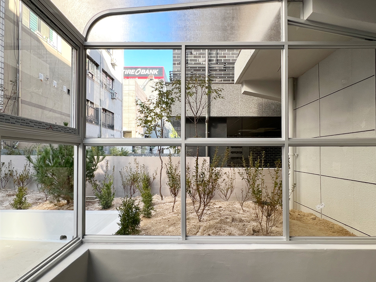 남측도로에 면한 내부주차장을 도로변으로 개방하여, 법적으로는 주차장이지만 1층에서 서비스 외부공간으로 활용을 유도하고, 뒤편의 옥외주차장과 조경공간으로 연결되는 작은 사잇길이 형성되도록 하였다. 넓지 않은 공간이지만 쾌적하게 관리 및 활용되어, 가로변과 소소한 여유와 활력을 공유하기를 바랐다.