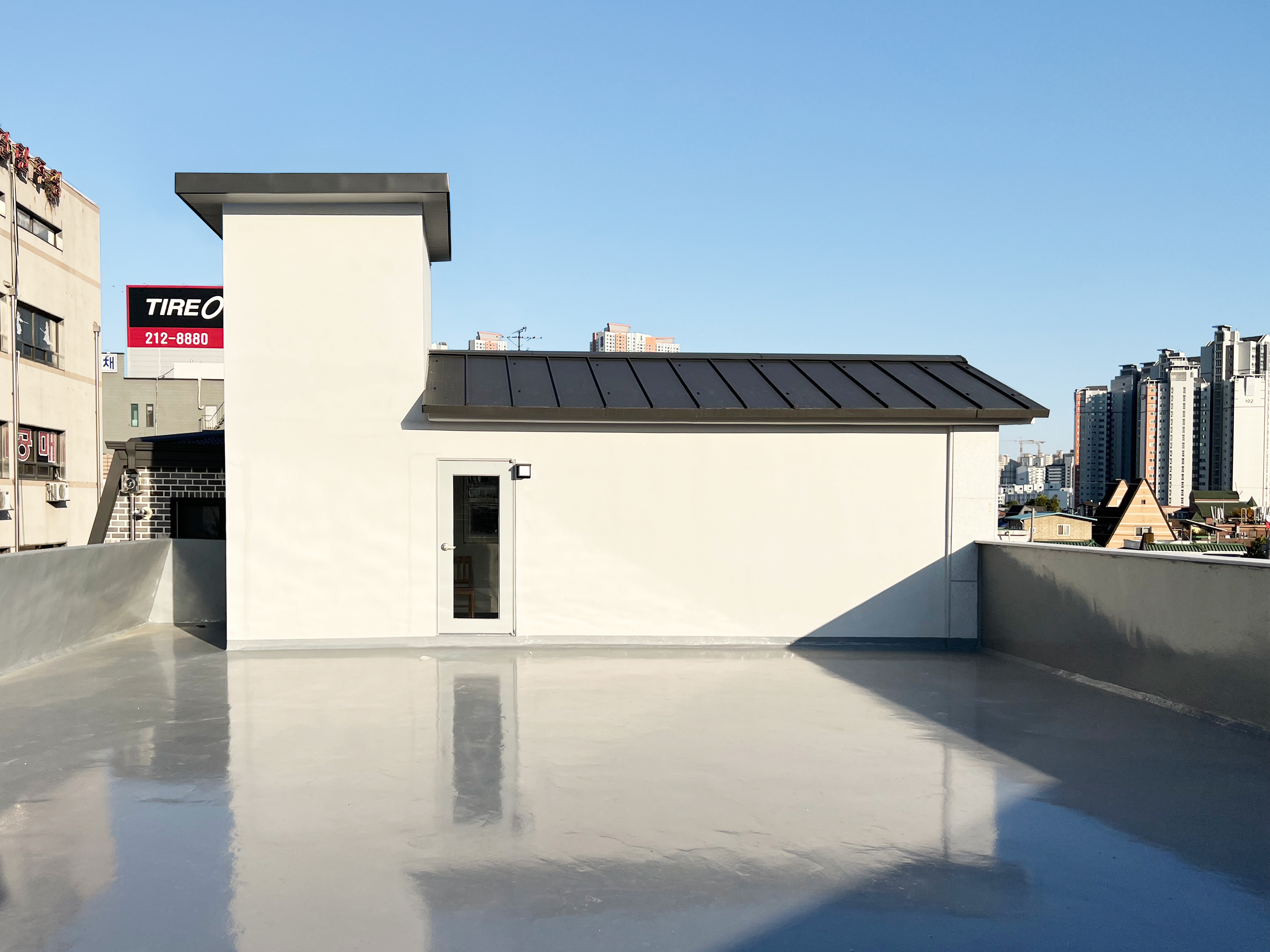건물은 간판으로 뒤덮인 근생빌딩과 상가주택, 다세대주택이 혼재한, 우리에게 너무나 익숙한 이면도로의 풍경 안에 자리하고 있다. 이러한 맥락에서 골목 건축을 지시하는 박공지붕 형태의 옥탑을 존치한다. 새로운 질서에 의한 다소 엄격한 표정과, 그에 대비되는 투박함과 자연스러움. 어울리지 않을 듯한 두 요소의 결합은 낯설지만 동시에 친근한 얼굴을 만든다.
