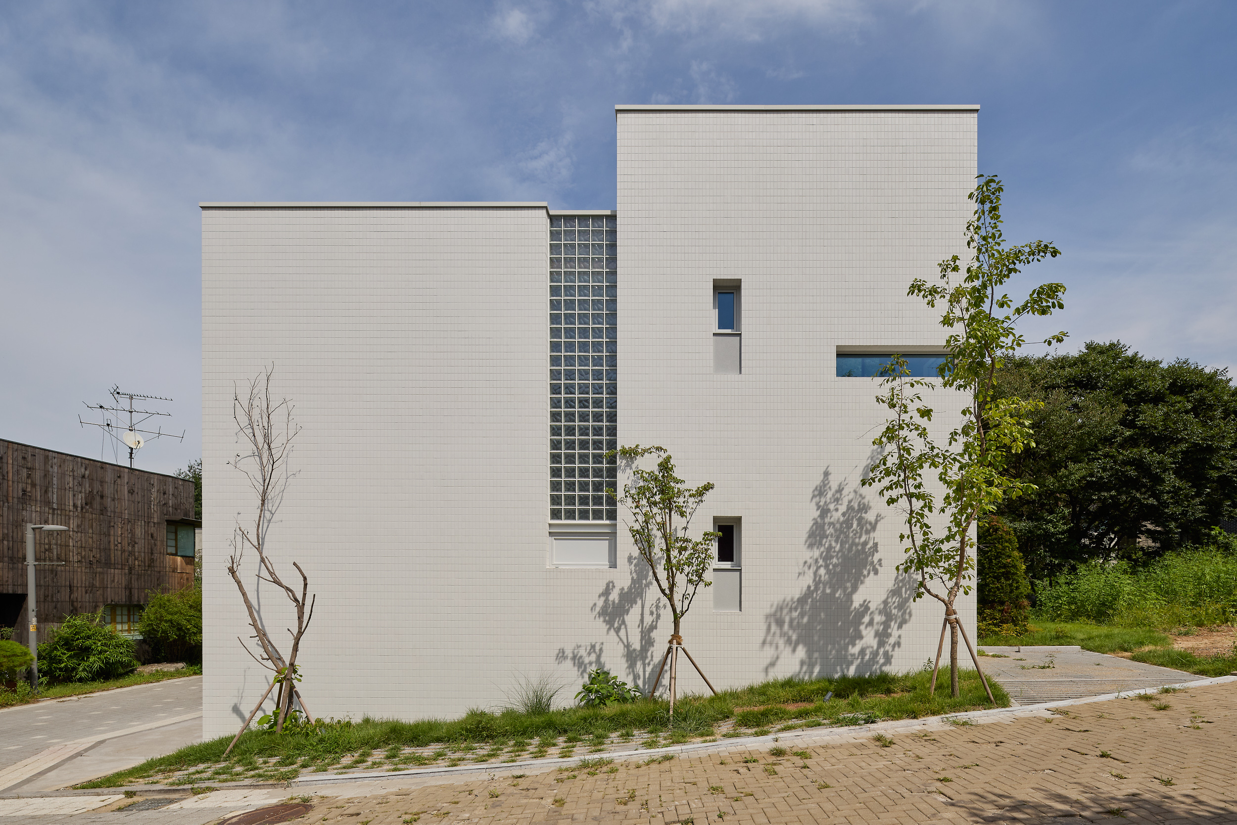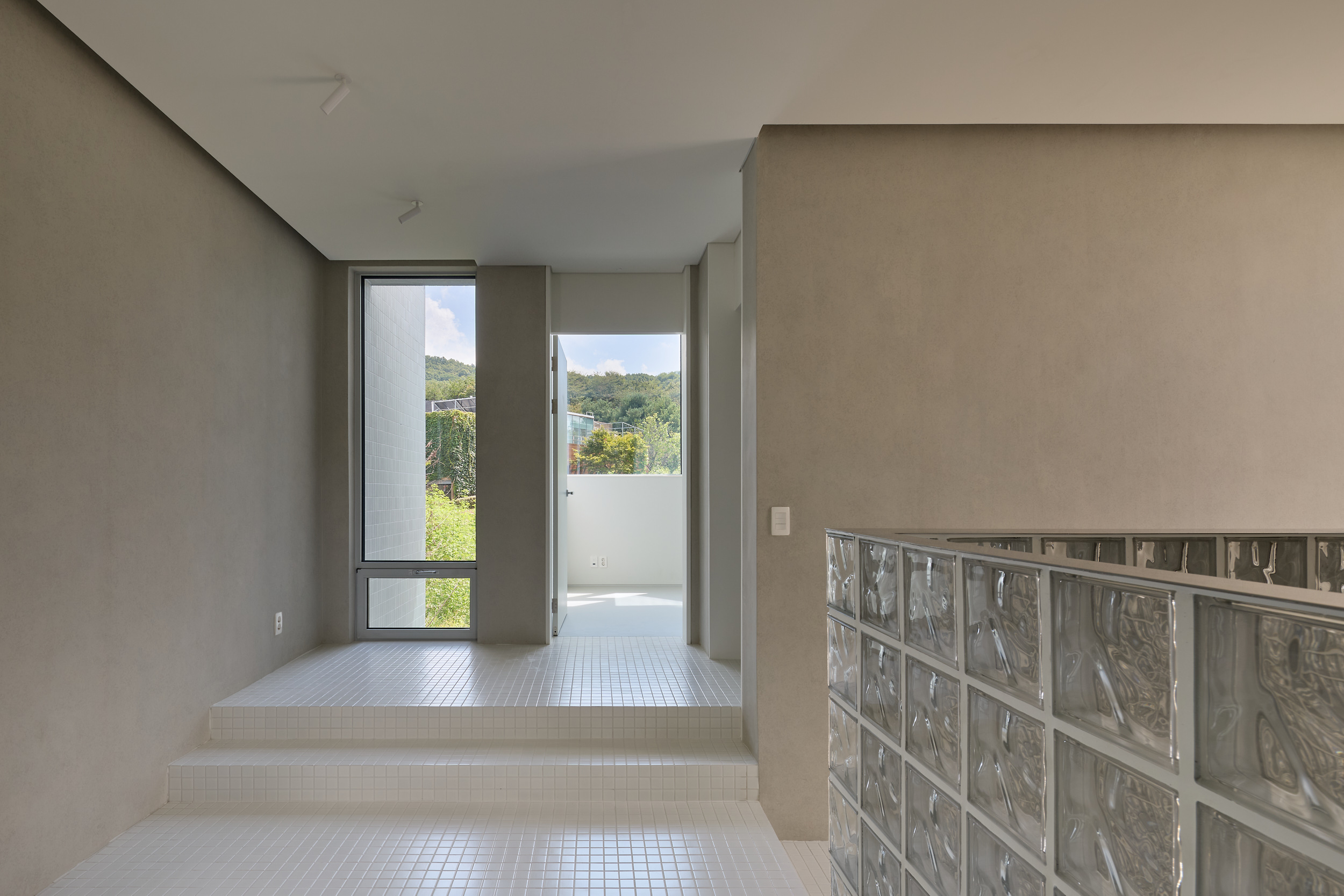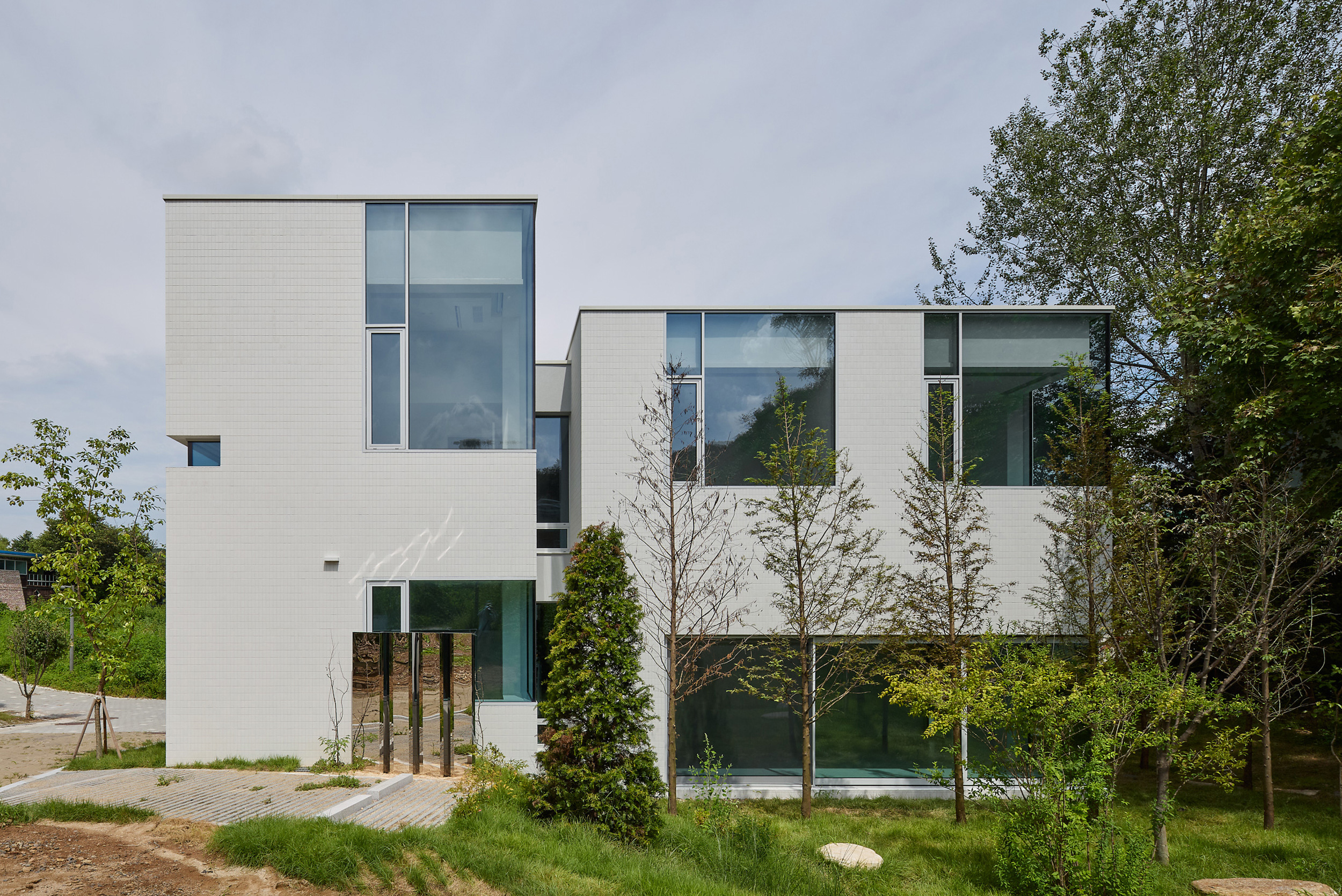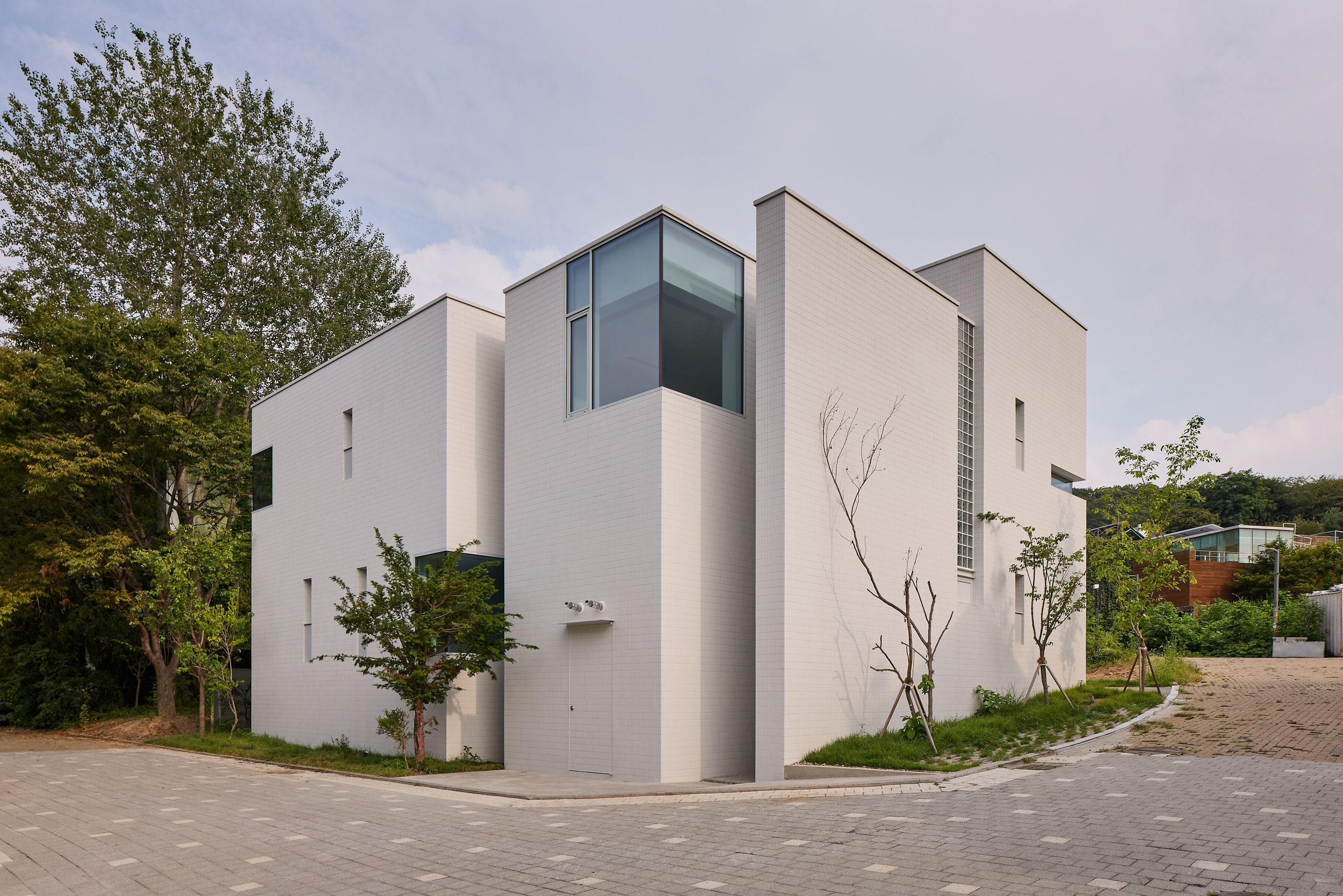 진입로에서 바라보는 건물은 주변 건물과 비슷한 형태적 결을 유지하면서도, 창이 최소화되어 흰색 타일로 덮여 있는, 밝으면서 폐쇄적인, 친근하면서도 이질적인 이중적 인상을 남긴다. 이 낯선 감각은 도로 모퉁이의 좁은 진입 통로를 지나 내부로 이어지며 더욱 증폭된다. 그러나 곧, 조여들던 감각은 건물 후면의 숲을 향해 넓게 열리는 공용공간에 이르며 급격하게 이완된다. 공간은 온전히 숲을 향해 확장되고, 앞에서의 긴장과는 반대되는 낯선 개방감을 맞이하게 된다.