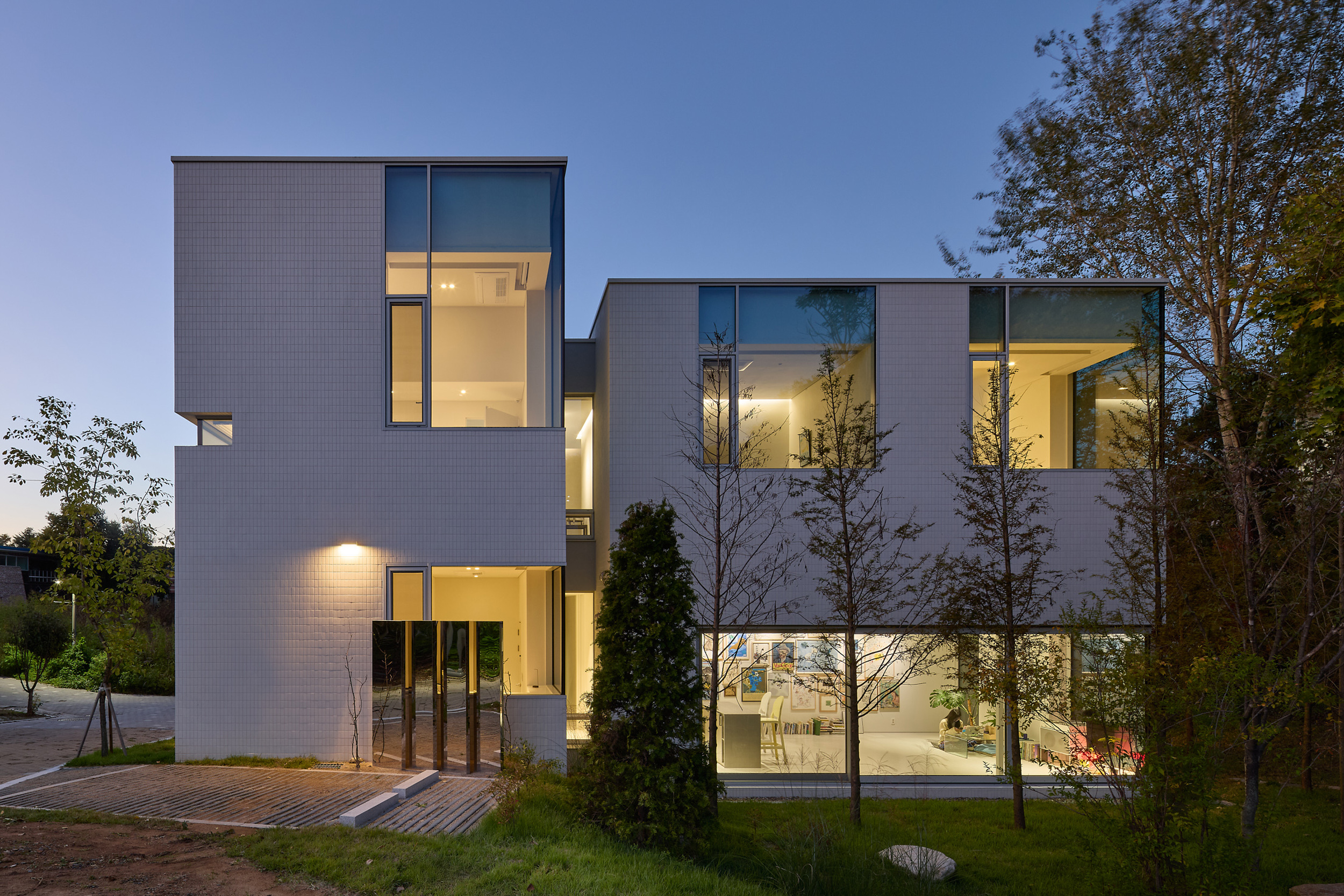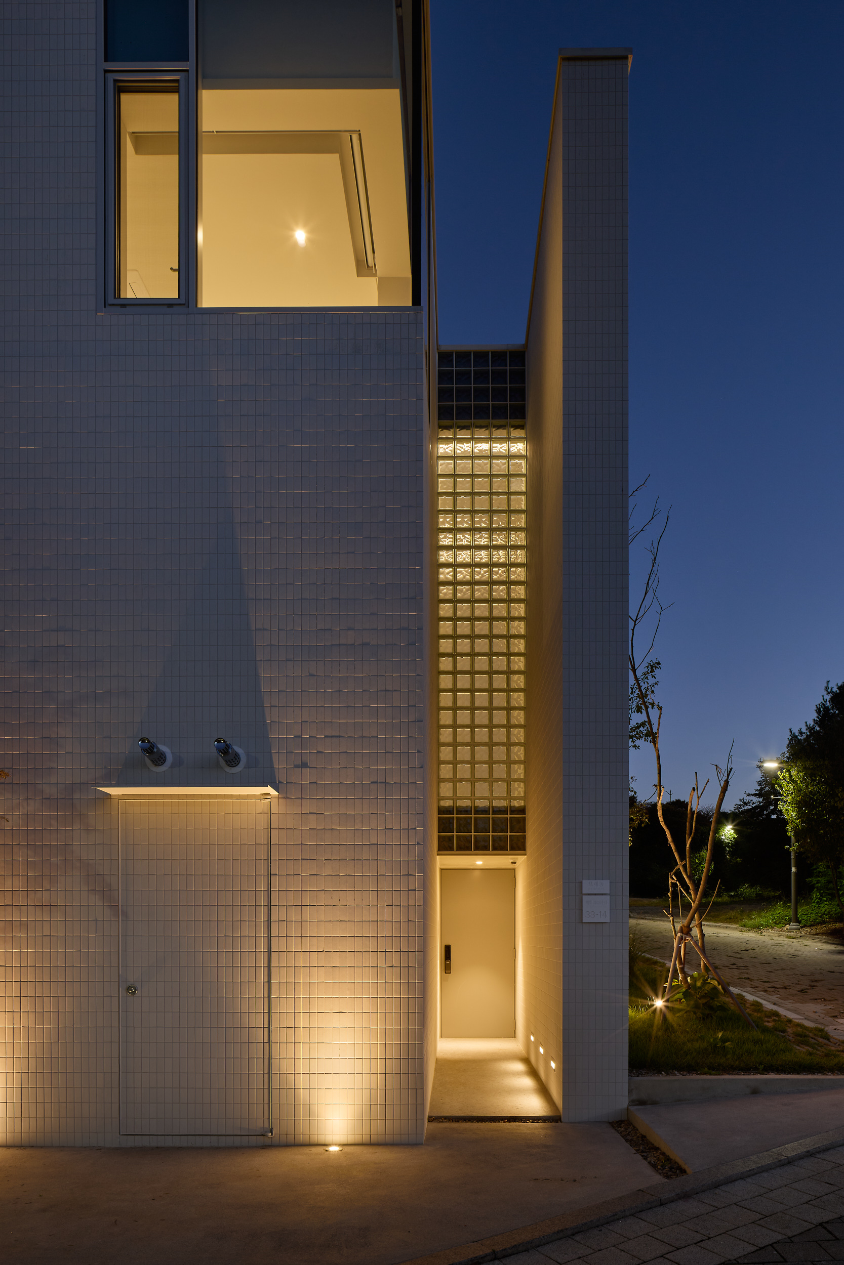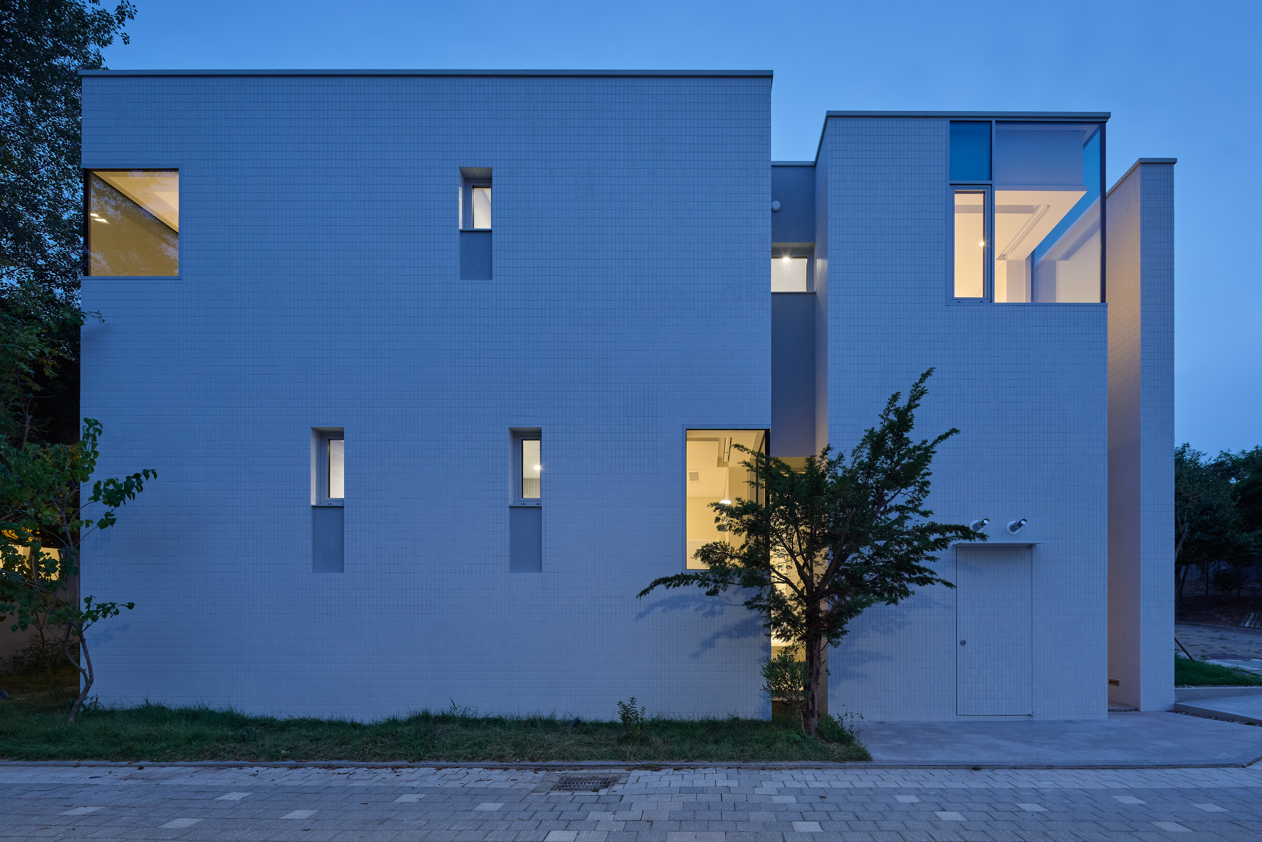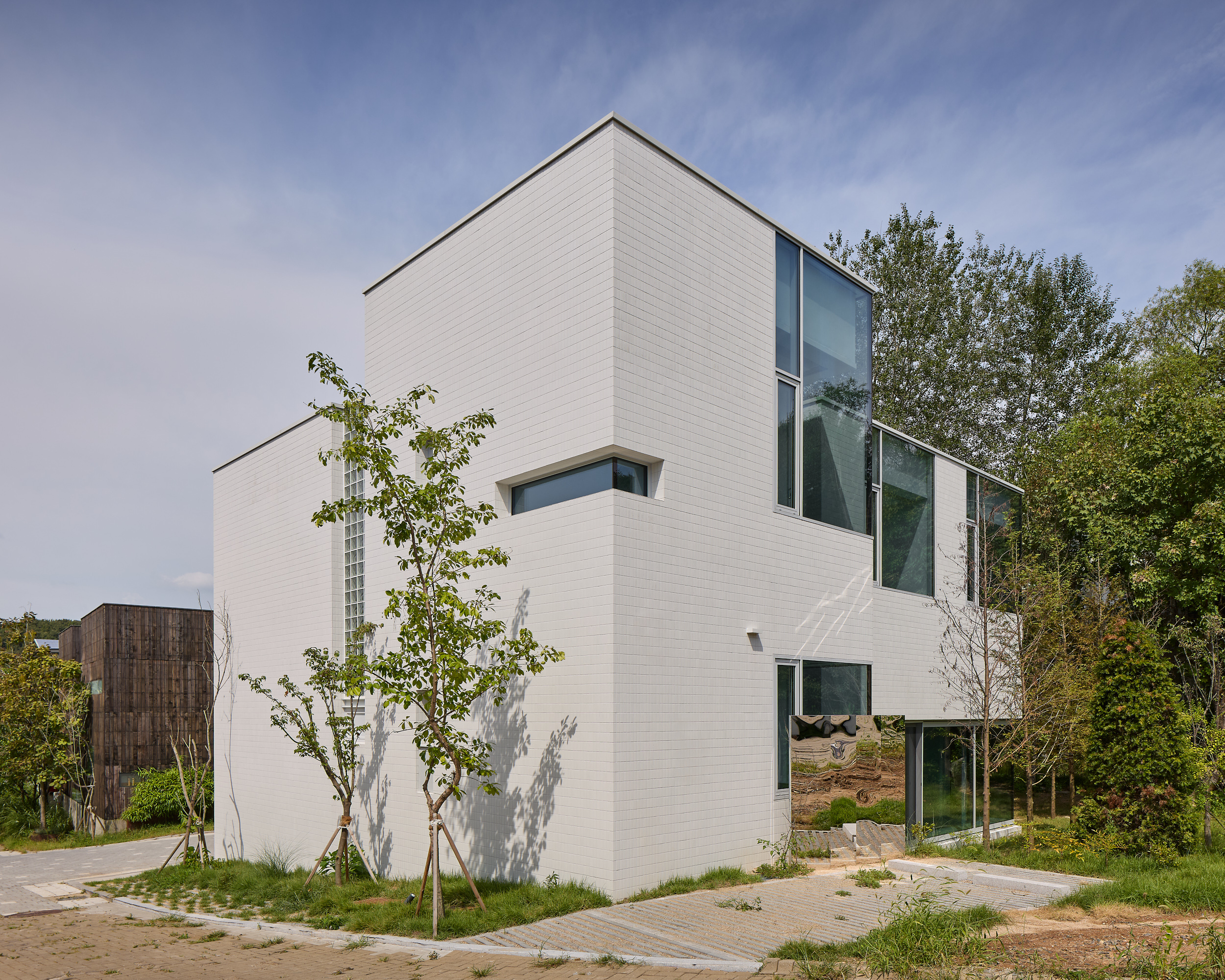 진입로에서 바라보는 건물은 주변 건물과 비슷한 형태적 결을 유지하면서도, 창이 최소화되어 흰색 타일로 덮여 있는, 밝으면서 폐쇄적인, 친근하면서도 이질적인 이중적 인상을 남긴다. 이 낯선 감각은 도로 모퉁이의 좁은 진입 통로를 지나 내부로 이어지며 더욱 증폭된다. 그러나 곧, 조여들던 감각은 건물 후면의 숲을 향해 넓게 열리는 공용공간에 이르며 급격하게 이완된다. 공간은 온전히 숲을 향해 확장되고, 앞에서의 긴장과는 반대되는 낯선 개방감을 맞이하게 된다.
