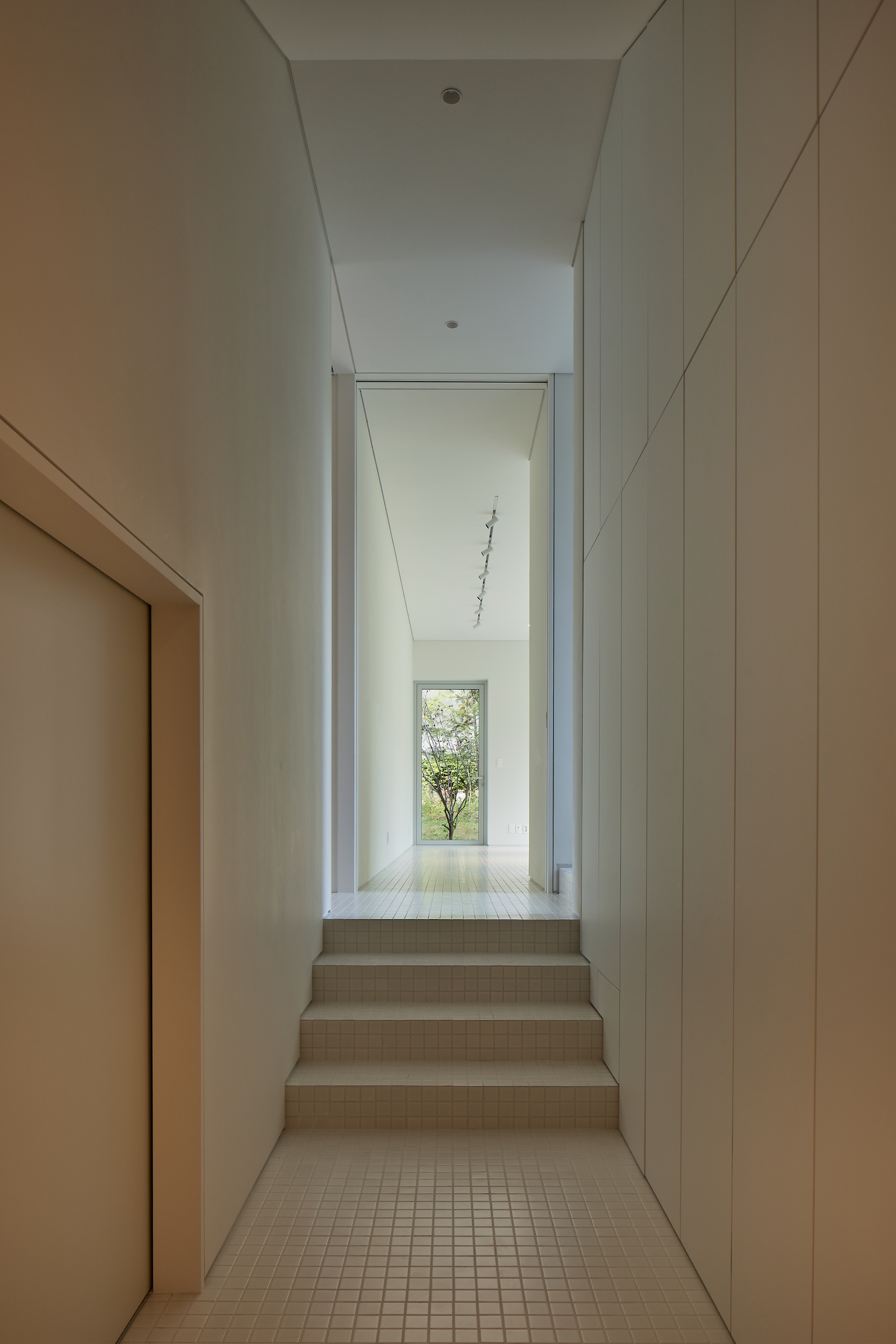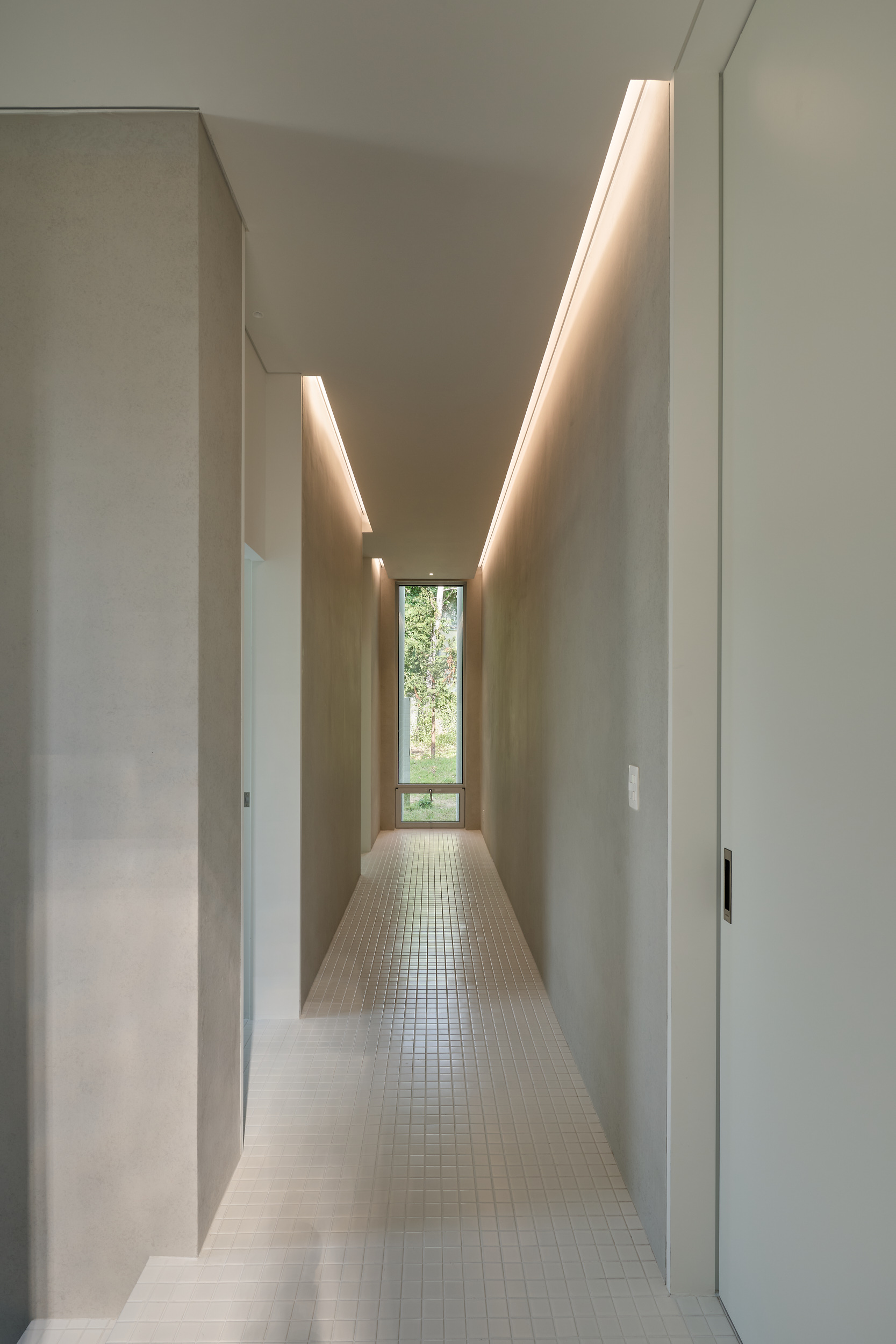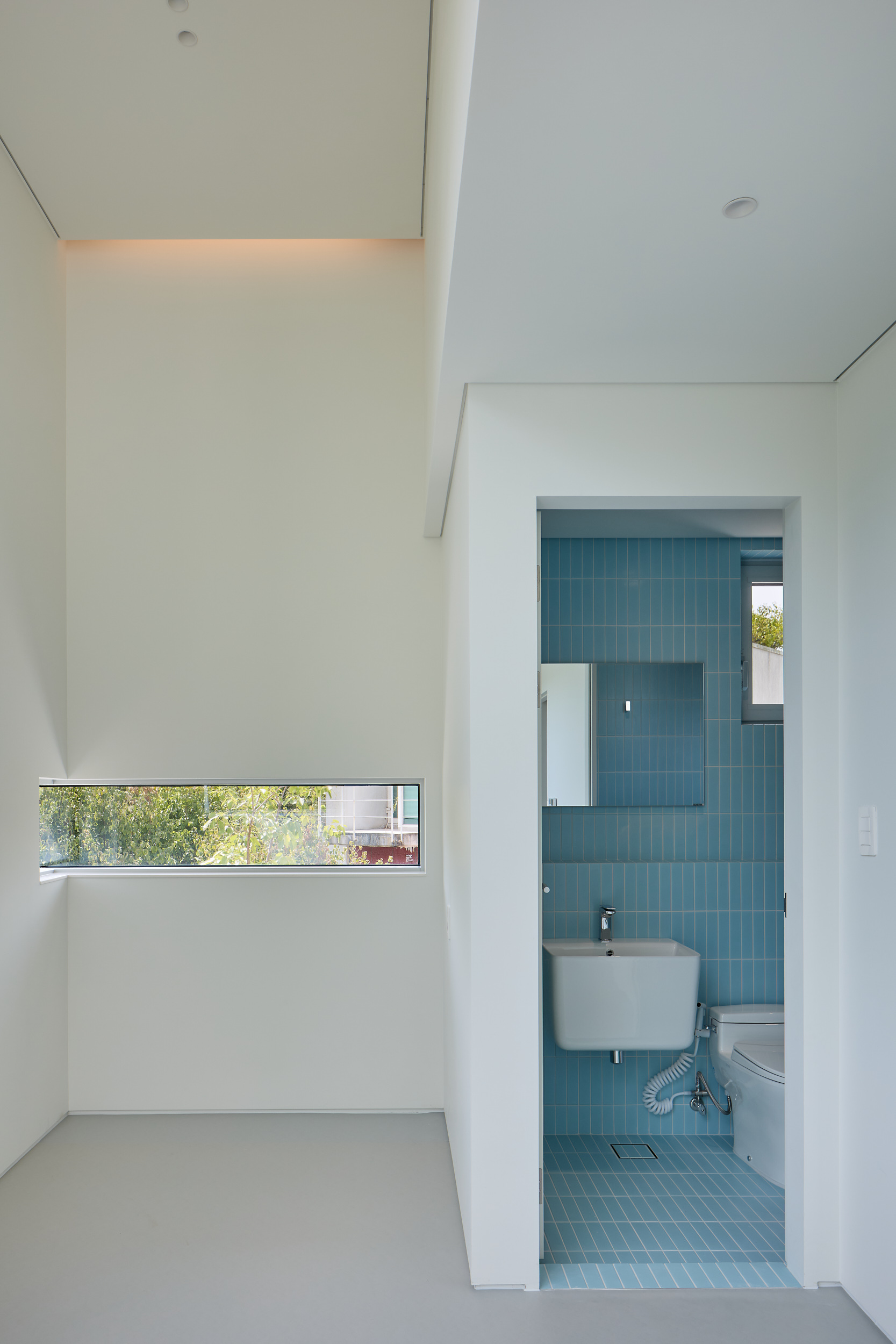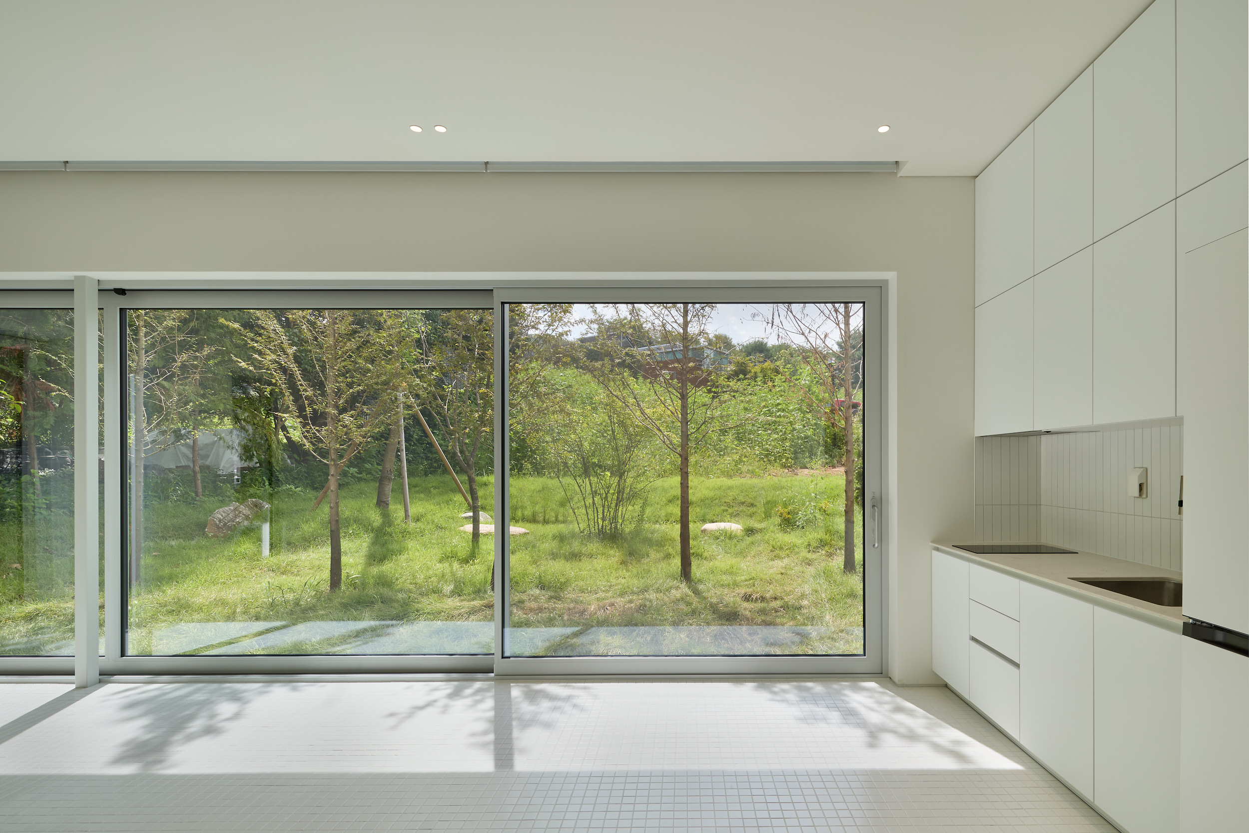 진입로에서 바라보는 건물은 주변 건물과 비슷한 형태적 결을 유지하면서도, 창이 최소화되어 흰색 타일로 덮여 있는, 밝으면서 폐쇄적인, 친근하면서도 이질적인 이중적 인상을 남긴다. 이 낯선 감각은 도로 모퉁이의 좁은 진입 통로를 지나 내부로 이어지며 더욱 증폭된다. 그러나 곧, 조여들던 감각은 건물 후면의 숲을 향해 넓게 열리는 공용공간에 이르며 급격하게 이완된다. 공간은 온전히 숲을 향해 확장되고, 앞에서의 긴장과는 반대되는 낯선 개방감을 맞이하게 된다.
