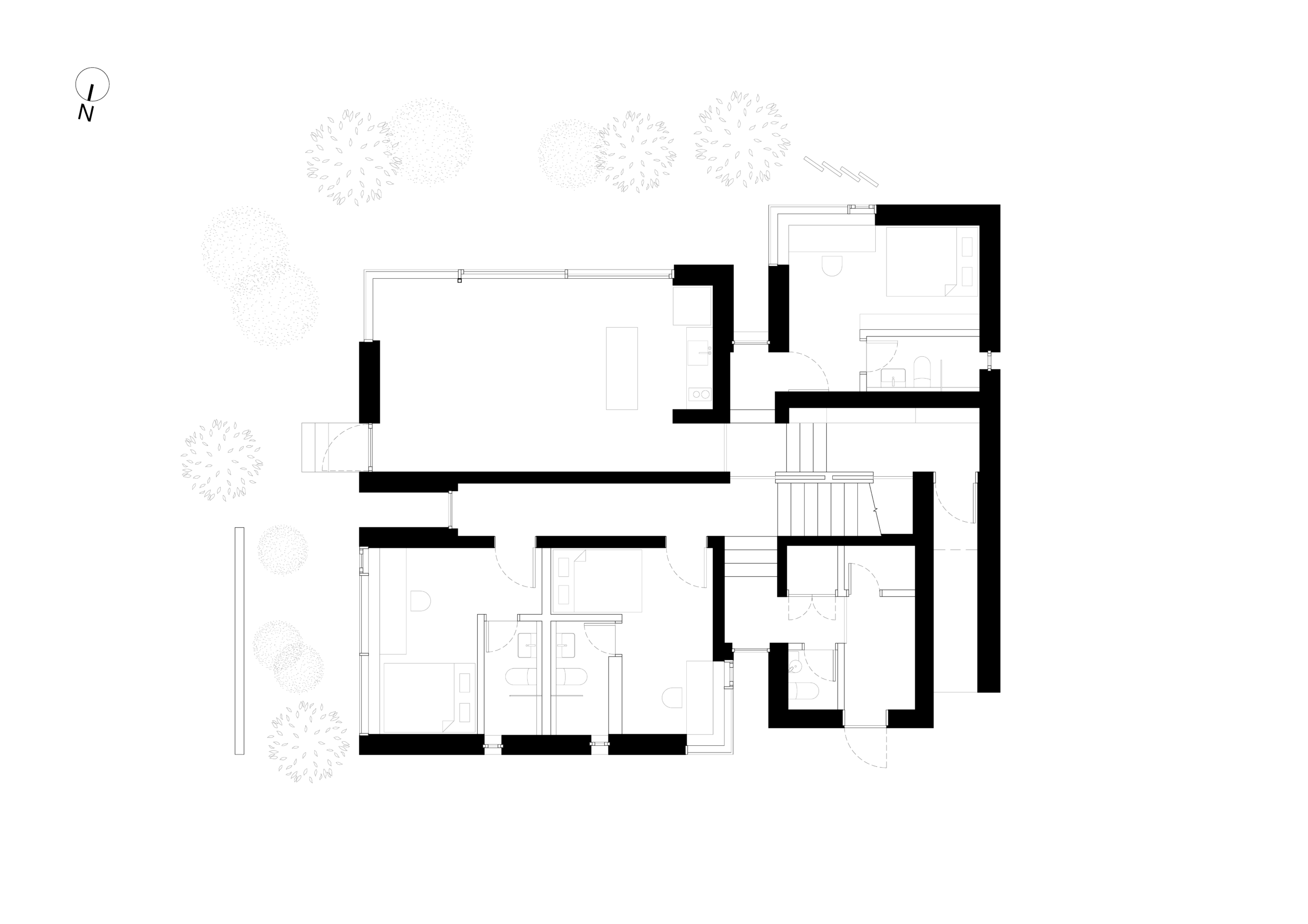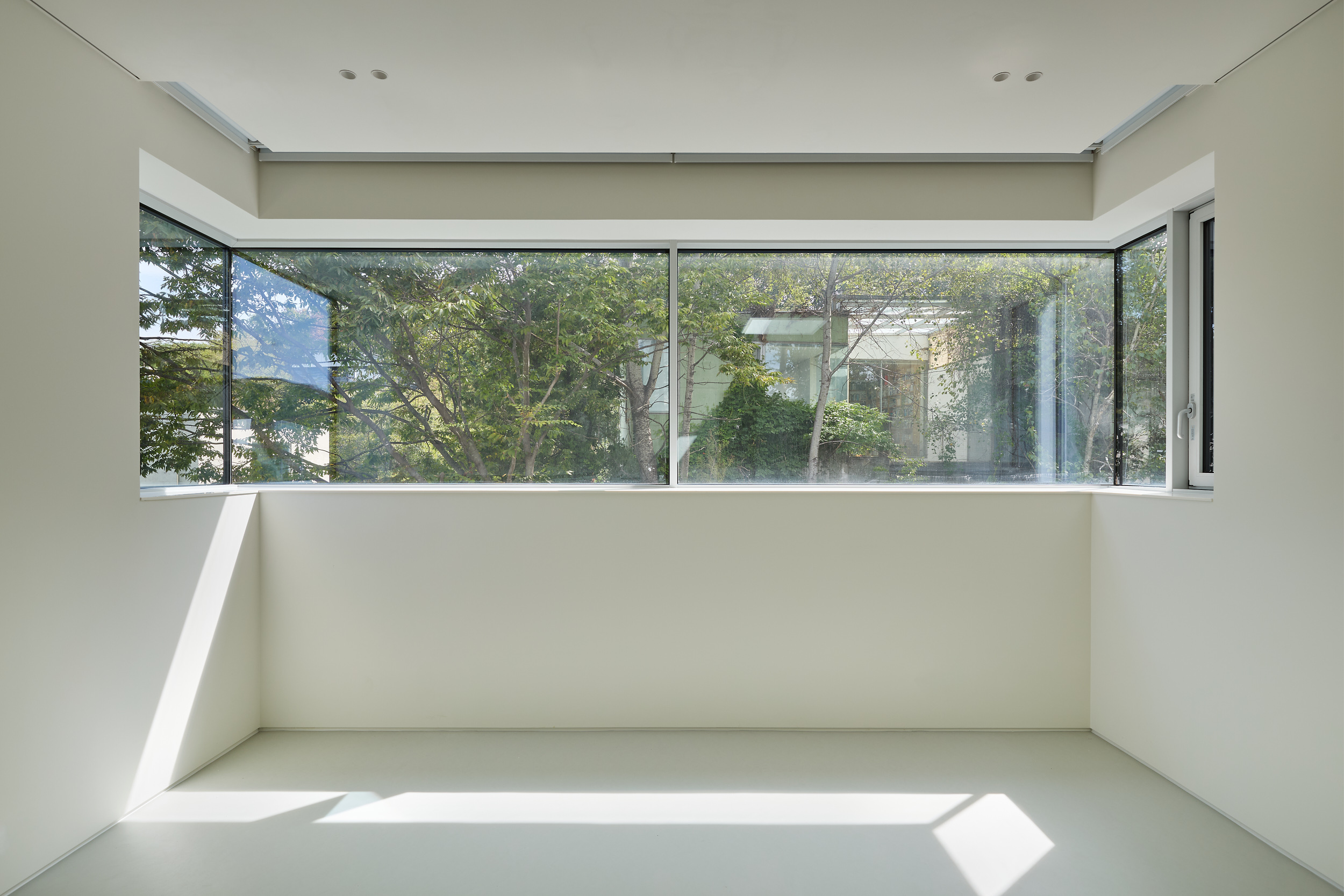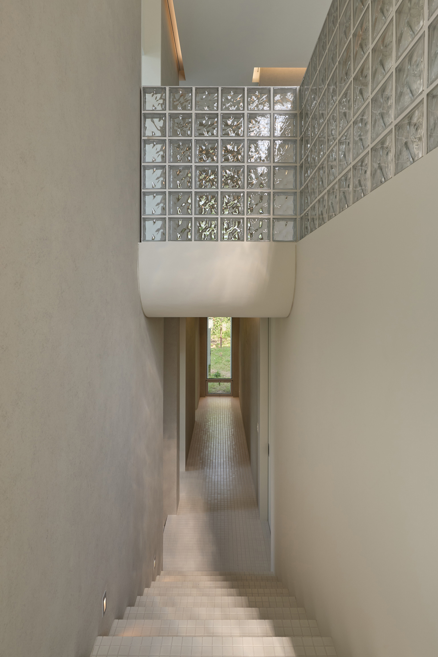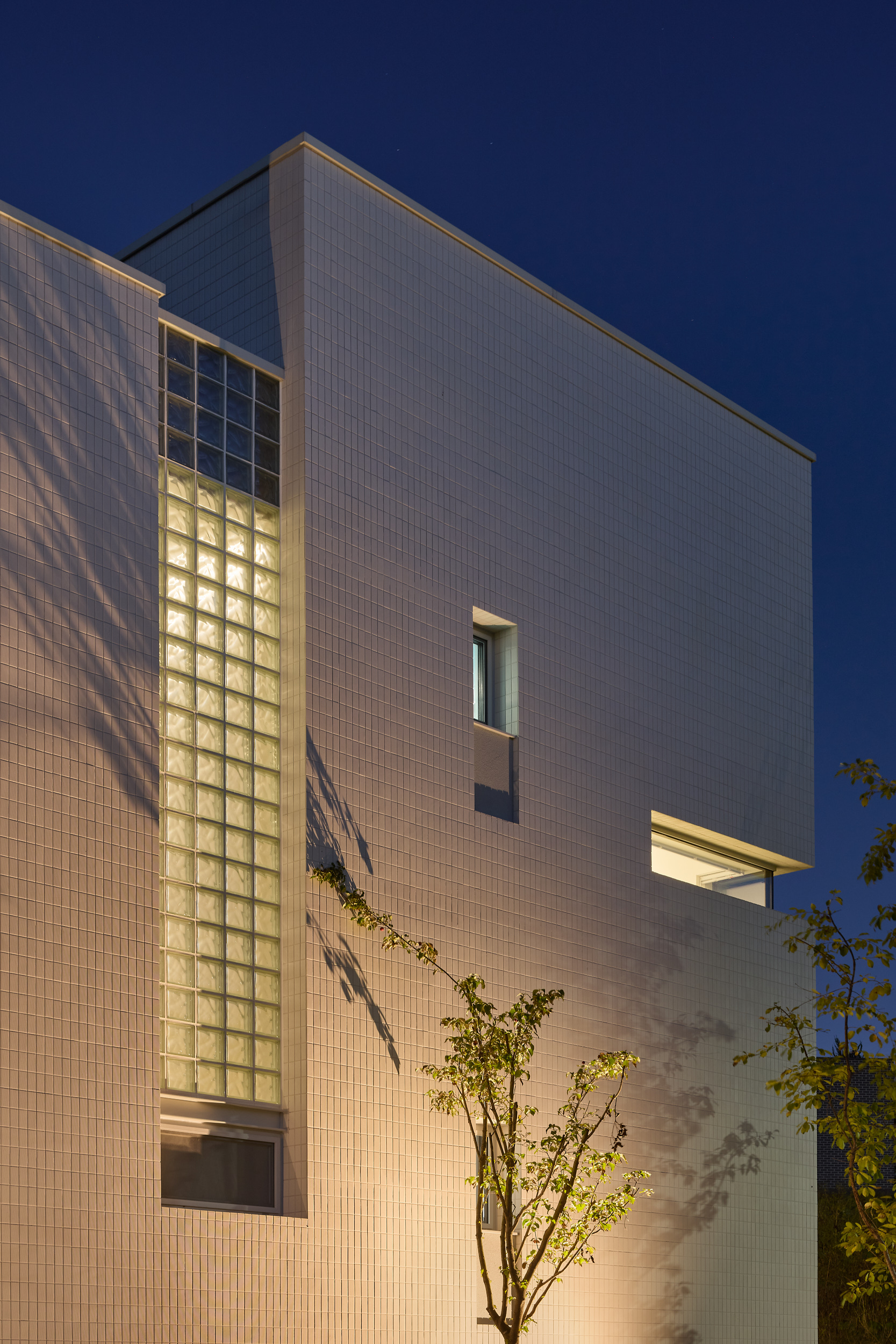 진입로에서 바라보는 건물은 주변 건물과 비슷한 형태적 결을 유지하면서도, 창이 최소화되어 흰색 타일로 덮여 있는, 밝으면서 폐쇄적인, 친근하면서도 이질적인 이중적 인상을 남긴다. 이 낯선 감각은 도로 모퉁이의 좁은 진입 통로를 지나 내부로 이어지며 더욱 증폭된다. 그러나 곧, 조여들던 감각은 건물 후면의 숲을 향해 넓게 열리는 공용공간에 이르며 급격하게 이완된다. 공간은 온전히 숲을 향해 확장되고, 앞에서의 긴장과는 반대되는 낯선 개방감을 맞이하게 된다.