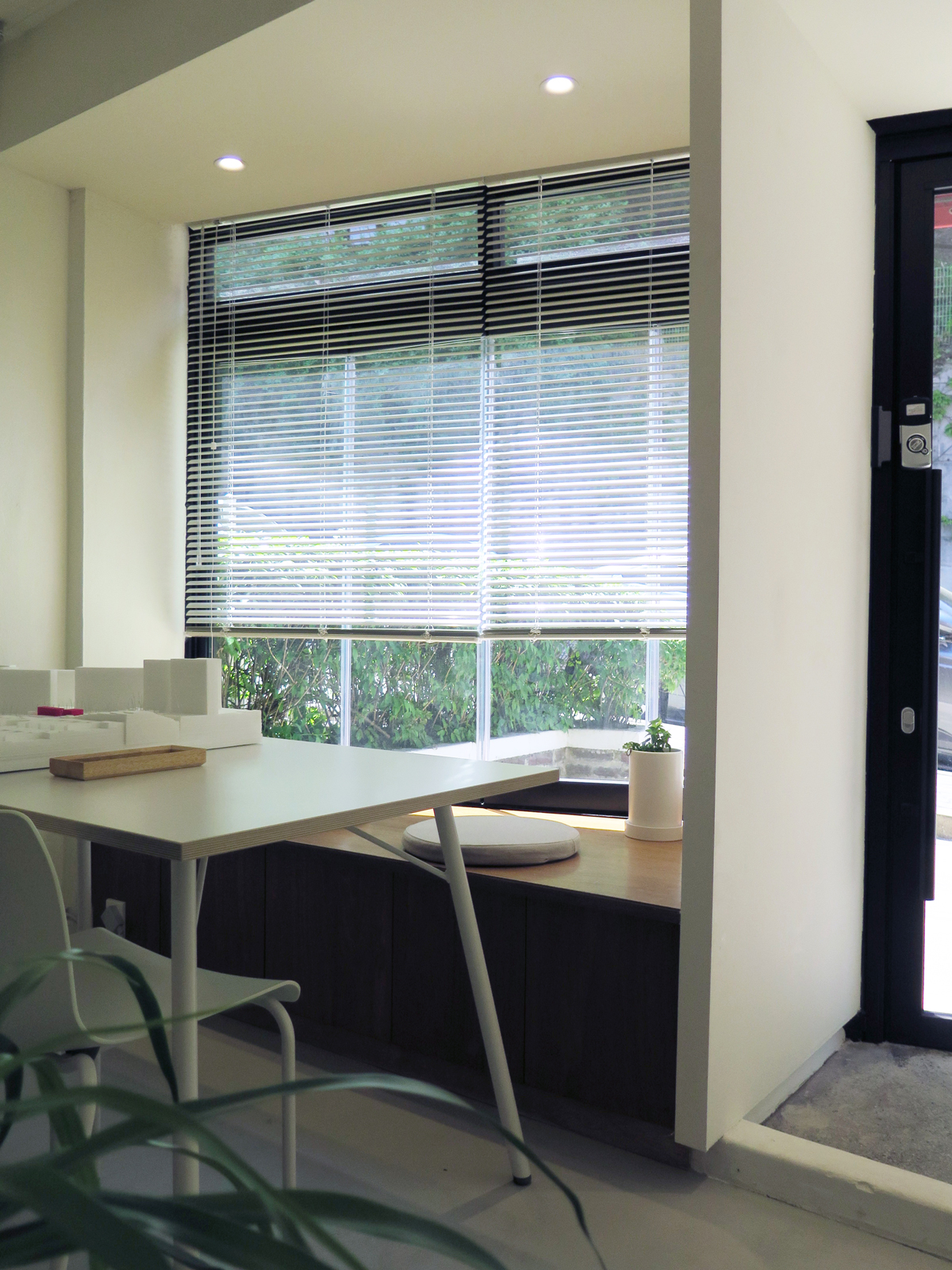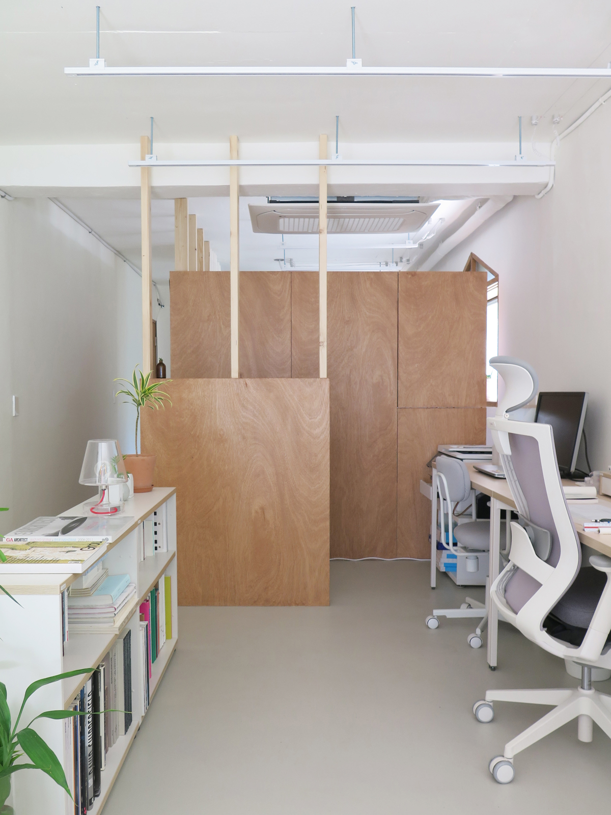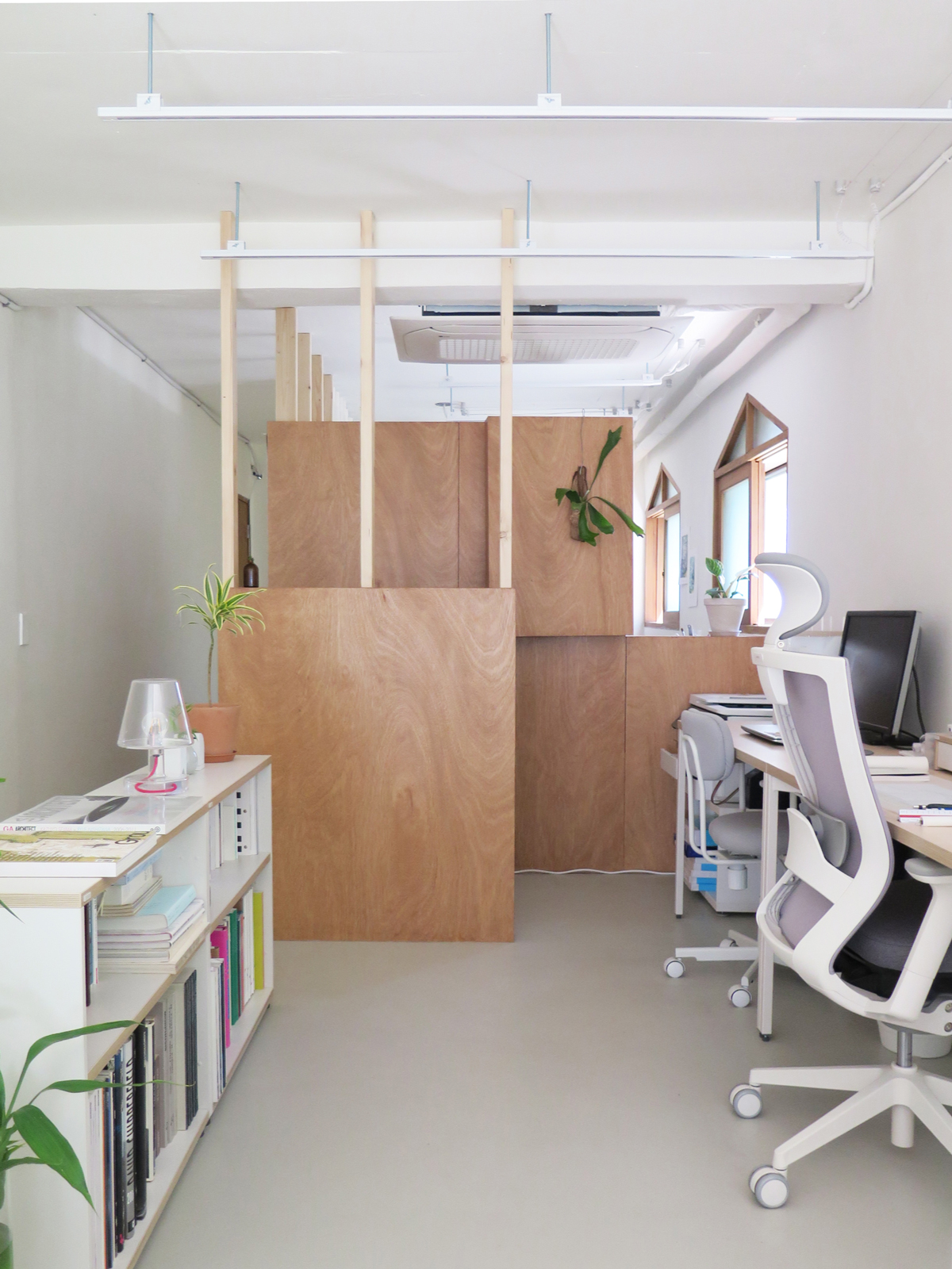 두 사람의 작업공간으로 넉넉지 않은 면적과 예산에서, 최소한의 건축적인 제스처로 공간이 각자의 필요에 적절히 대응할 수 있도록 고민하였다. 박공형태의 창과 조응하는 ‘ㄱ’자의 목재 벽은, 작업공간에서 일상의 많은 시간을 보내는 사용자에게 주거공간과 같은 편안한 감각을 제공할 것이다.